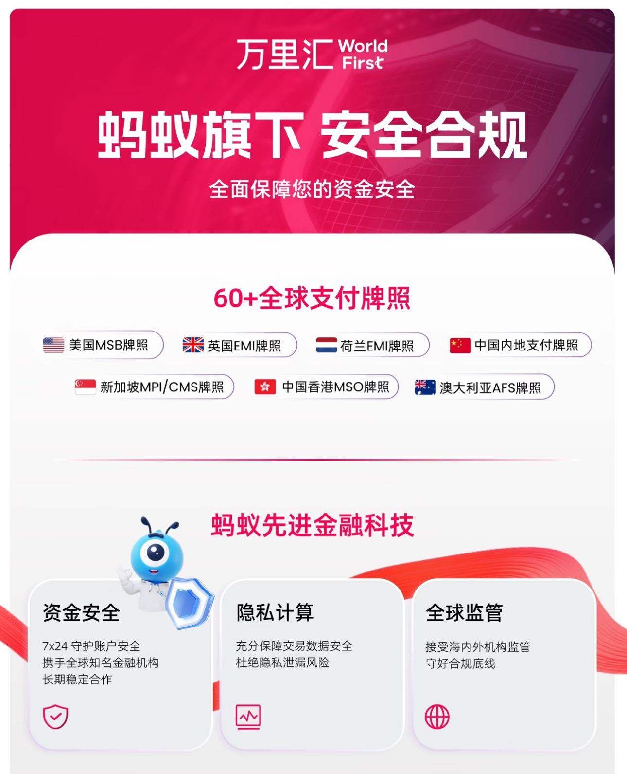 万里汇(WorldFirst)是蚂蚁集团旗下专业跨境支付品牌,深耕跨境贸易服务二十余年,持有60 + 张境内外权威支付牌照,服务全球超100 万外贸及电商企业,累计交易规模突破数千亿美元,覆盖210 + 国家和地区。凭借安全合规、低成本、高效率、全场景覆盖的核心优势,万里汇为 B2B 外贸企业提供从全球收款、阳光结汇、跨境付款、汇率管理到企业支付卡的全链路资金解决方案,真正实现 “一个账户,轻松收付全球”。