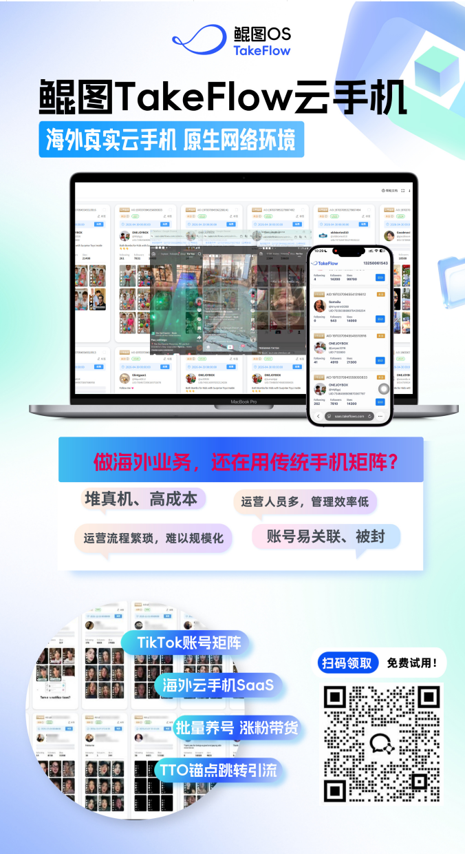 鲲图TakeFlow 是一款专为跨境电商和出海企业打造的“海外云手机SaaS营销系统”。3分钟即可极速开通具备原生海外环境的真实手机环境,免前置网络直连海外机房。系统支持高质量 TikTok 账号矩阵的隔离运营、一键批量发布、AI智能养号以及视频锚点极速引流站外。助力企业硬性成本降低 80%、人力成本下降 70%,让出海获取全球社媒流量变得极其简单高效。